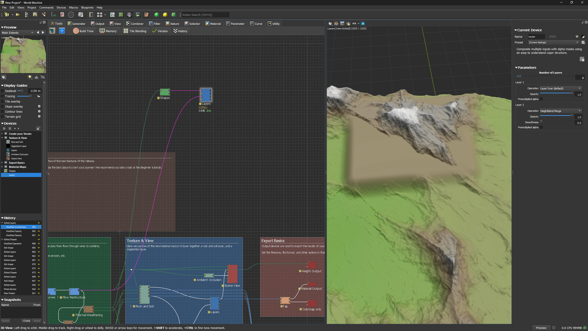 You could actually just do this with a single Layers device, if I’m understanding correctly. You set up your different shapes (In the example file I provide, I have them all in a single Shapes device, but that doesn’t necessarily have to be the case), set those as the lowest layer, then add your terrain as the next layer, and switch the mode to Heightblend Merge, and you should be off to the races! Here’s an example file just to make sure I’m understanding the issue correctly and so you can quickly test if it works for your specific use case.