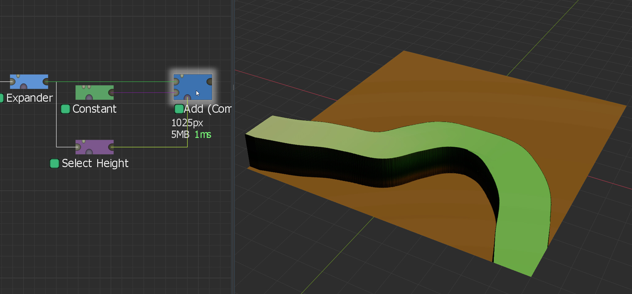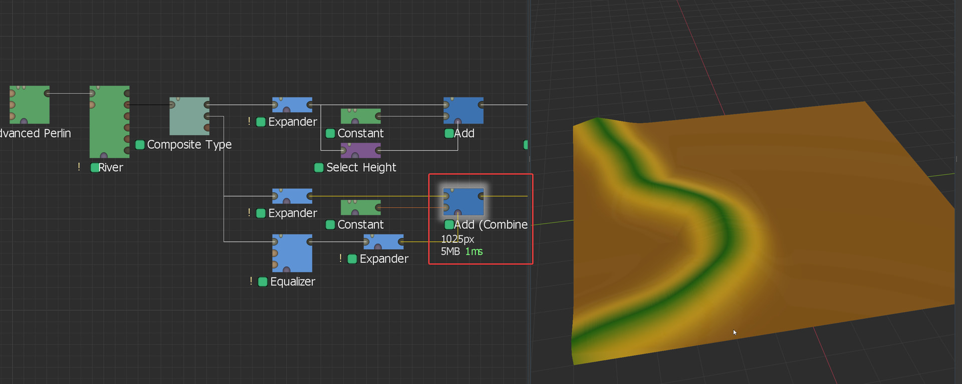 From there, we now need to actually raise that surface up, but it has to go up relatively evenly. There’s probably a better way to do this, but my thought process is that most of the “normal” devices to achieve this could alter the angle of the gradient from the high point to the low point. So what I do is just add a specified constant value. To do this, drop in a Constant generator and a Select Height device. The Expander output would go into the Select Height where you’d set the minimum height to 1m and the maximum as high as it will go, dropping the falloff to 0. This gets you a mask of just the river surface area. You’ll then pipe the Expander output and the Constant device into a Combiner set to Add and the strength all the way up. The Select Height should be piped into the mask input of the Combiner. From there, you can adjust the height of the river surface by changing the height of the Constant device.
