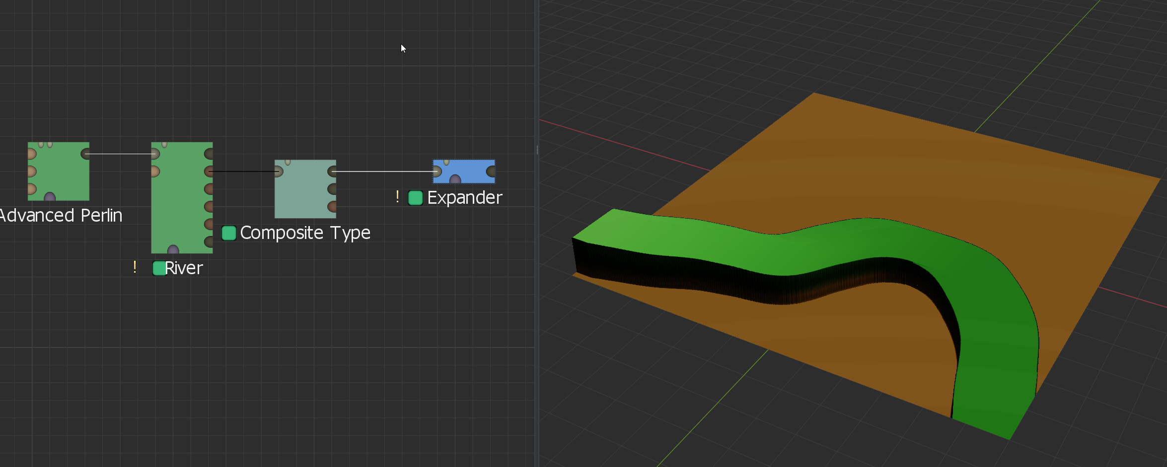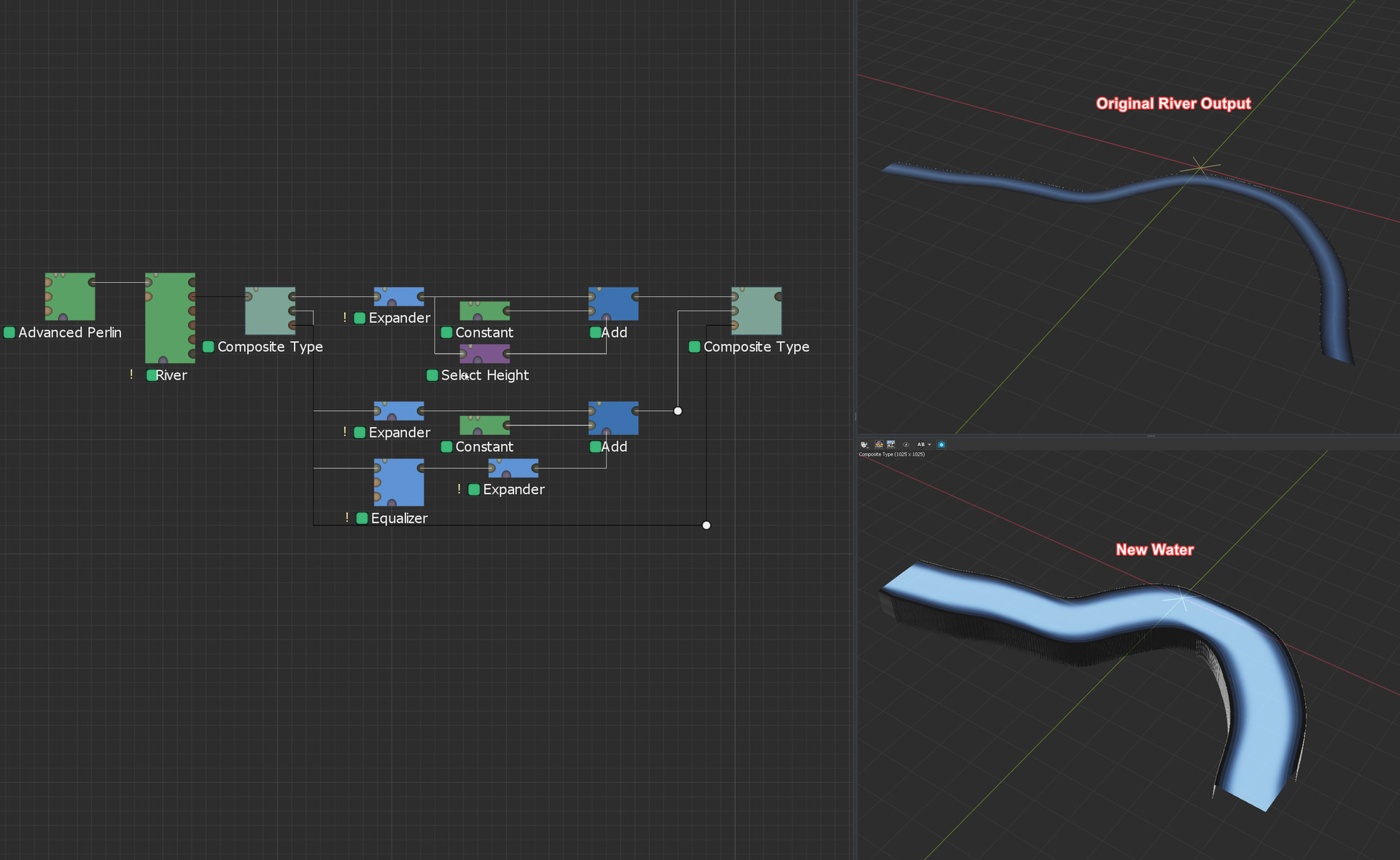 Now, if you’re just visually trying to raise the water level, you’re done! If you need the vector field to be updated so that your flow direction is accurate across the river, you’ll need to adjust that output as well, but that one is even more finicky than the depth is, so I’m leaving it out of this. Assuming you have all your outputs adjusted accordingly, you drop a new Composite Type device, set the type to Water, and set it to “Pack to Composite Type” for Pack/Unpack. From there, you’ll pipe in your new water surface and depth heightfields, as well as your vector field (if you’re not editing that, you can just pipe that straight across from the original Composite Type device, though I’ve added routing points here to make it easier to read visually), and you’ll have a new Water system ready to go!