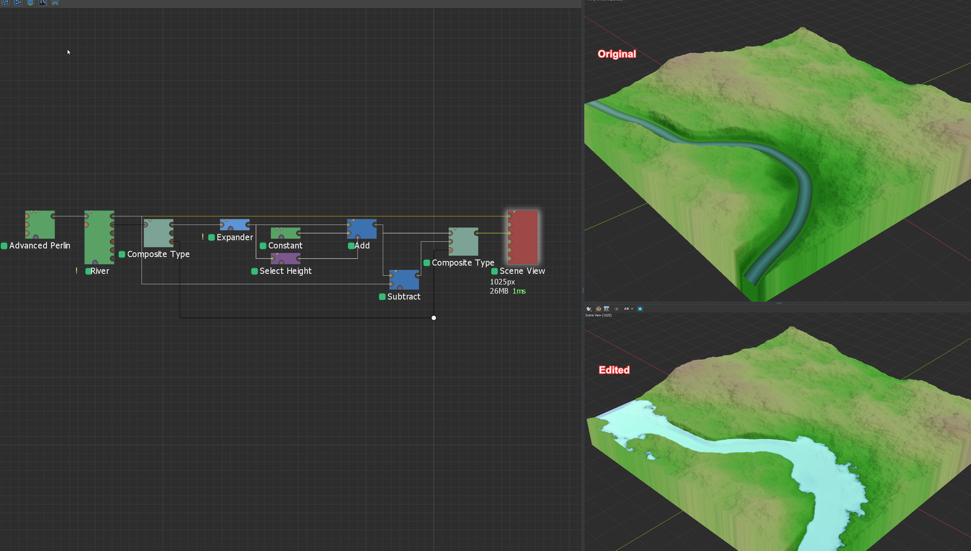 From here, I would pipe this water output into a Scene View device along with the terrain output by the original River device, and start tweaking values until the water was how I wanted it to be. You’ll notice in the screenshot below I heavily simplified the depth portion of the water. I was having trouble getting it to be accurate, so I simply took the new water surface heightfield, piped that into a Combiner set to Subtract, and piped in the terrain from the original River device as the second input, giving me basically a perfect representation of the water depth with the new height (although this does result in the water system looking more like standing water, like a lake or something, than a river system). You’ll also notice several small lakes/ponds appear, that’s because I had to extend the water pretty wide out to fill the channel at some points, not likely to be something you run into with your intentional channels and everything, but if you do, pretty easy to snip out with a Shapes device.