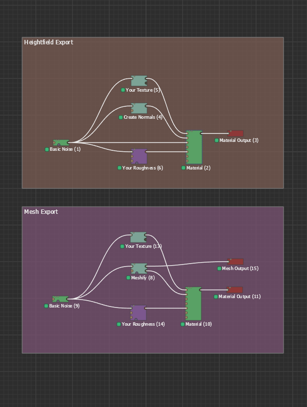 The top shows how you would connect things if you want to export a heightfield terrain, while the bottom shows for a mesh.