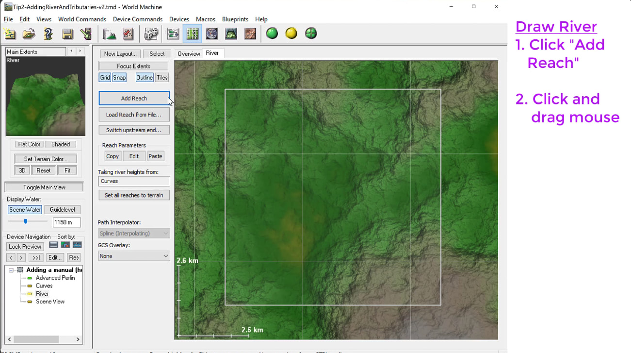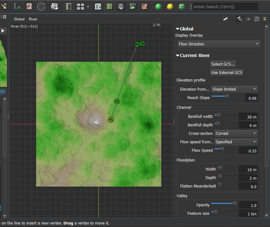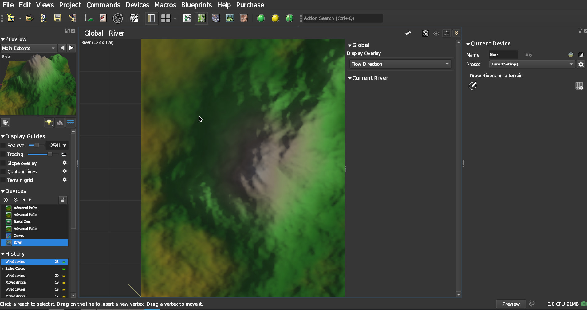 To draw a river, add a River device to your world, wire the terrain into its input, and double-click it. Then hit A (or go to Global->Add River) and draw your river